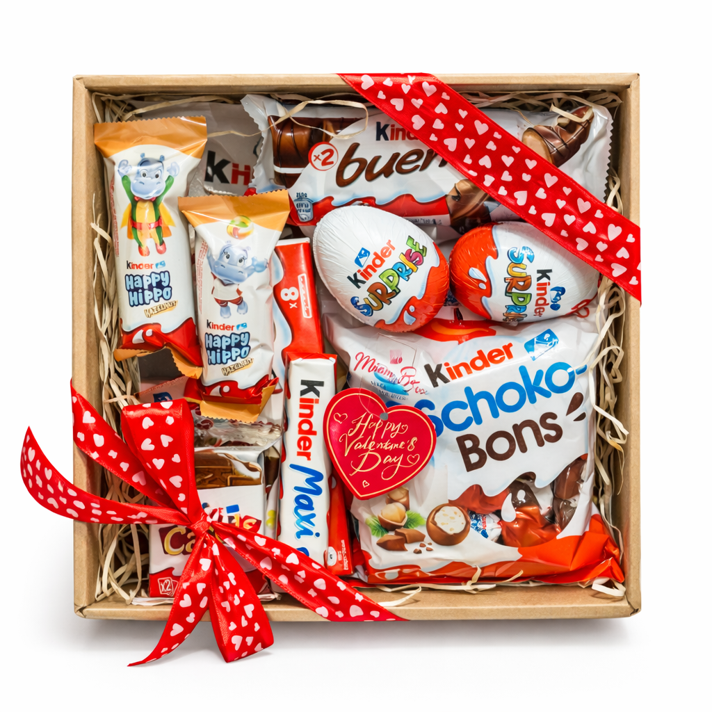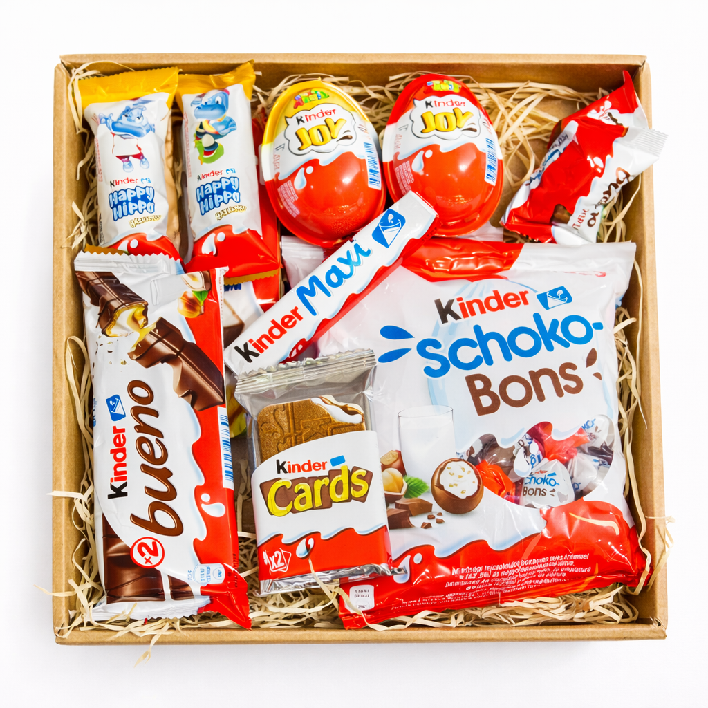 1 x ozdobné balenie krabička s vekom , Kinder čokoláda 8 ks , Kinder bueno 1x, 1x Kinder Cards, Kinder Happy Hippo 2x, Kinder Maxi 1x , Kinder Surprise 2x, mini bueno a chocolate bons celé balenie , zdobenie krabice