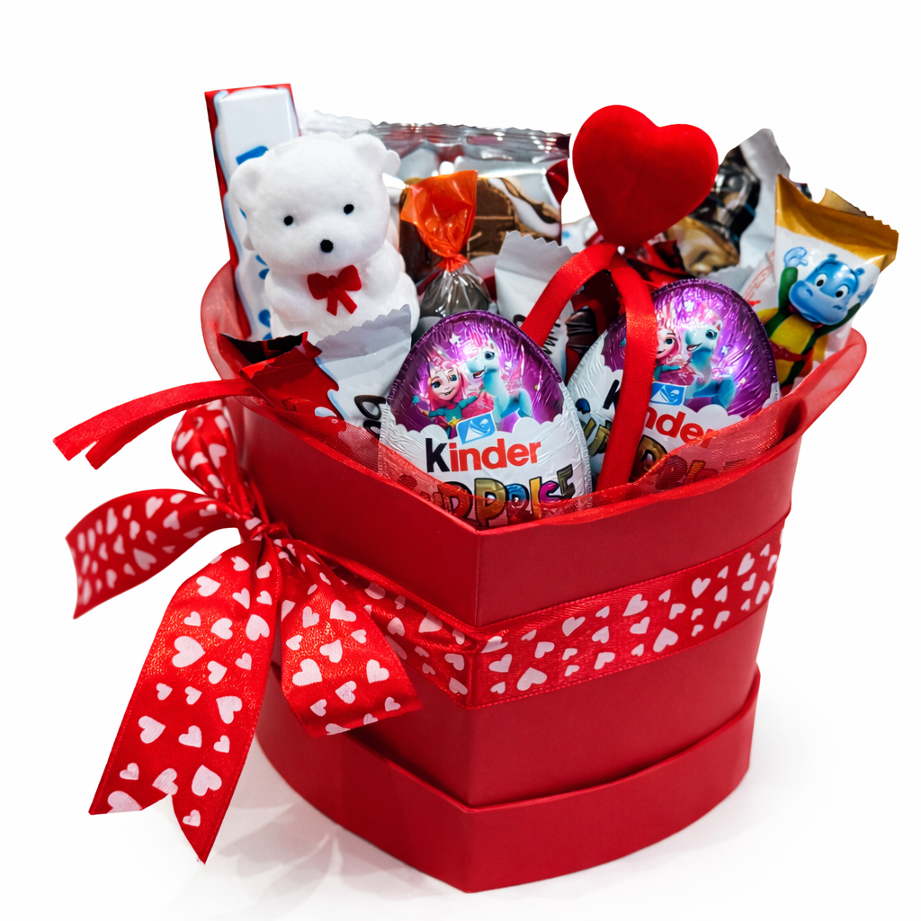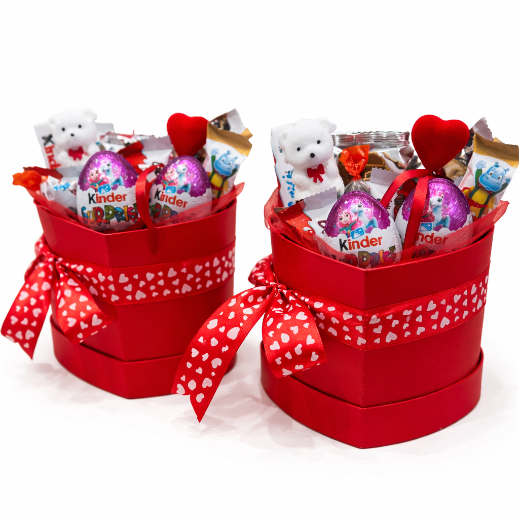 1 x darčekový box v tare srdca, 1x Kinder bueno, 1x Kinder Country , 1x Kinder Cards , 1x Kinder Happy Hippo, 2x Kinder Surprise vajíčko , 1x Kinder maxi, mix Kinder Mini Bueno a Choco Bons, zdobenie