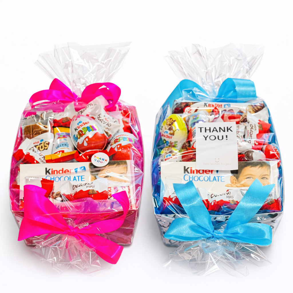 1 x ozdobné balenie , Kinder čokoláda 8 ks , Kinder bueno 1x, 1x Kinder Cards alebo Kinder Country 1x, Kinder Happy Hippo 1x, Kinder Surprise 2x, Choco bons celé balenie 1x, mini kinder bueno voľné , zdobenie – nálepka , ak si zvolíte