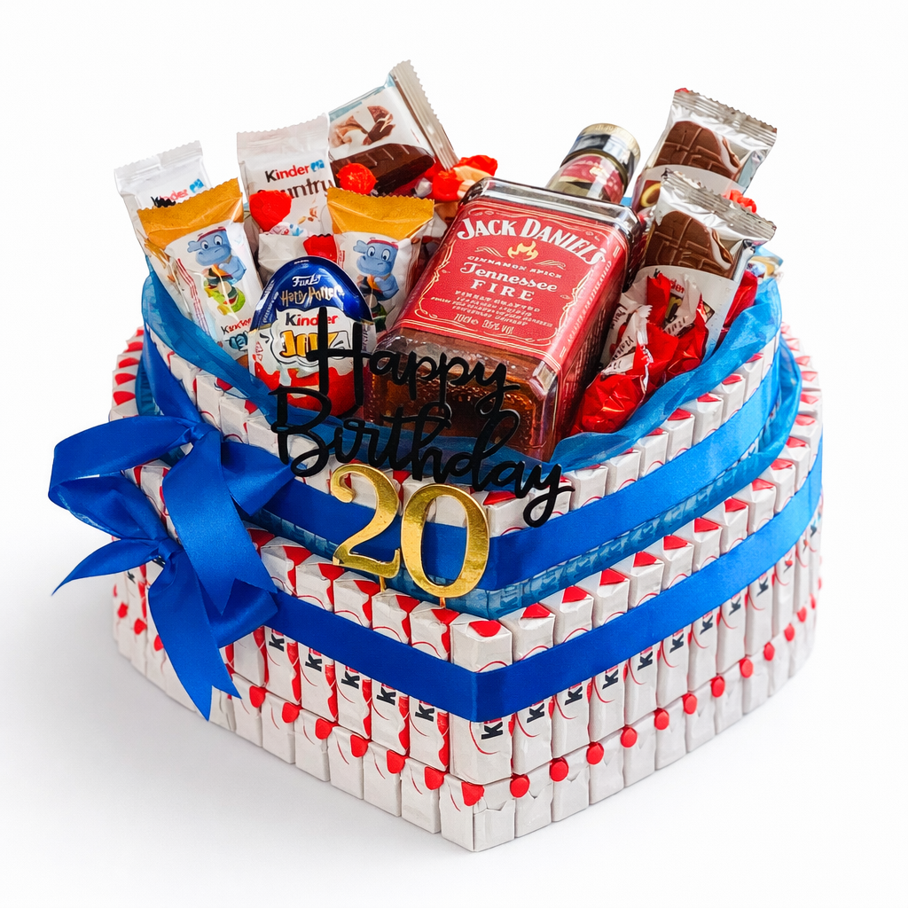 cca 90 ks Kinder čokolád po obvode, 1x Jack Daniels 0,7 l / alebo fľaša podľa výberu, 1 x Kinder Surprise vajíčko , 1x Kinder Delice, 2x Kinder Bueno , 2x Kinder Country, 2x Kinder Happy Hippo, 2x Kinder Cards, mix Kinder Bueno Mini a Choco Bons, zdobenie
