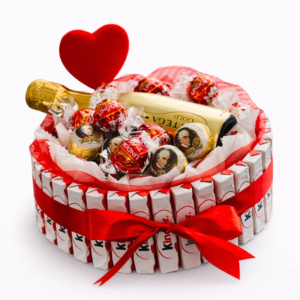 cca 33 ks Kinder čokolád po obvode, Raffallo voľné bonbóny a Lindt Lindor pralinky , 1x Prosecco Bottega Gold alebo šampanské Hubert , zdobenie