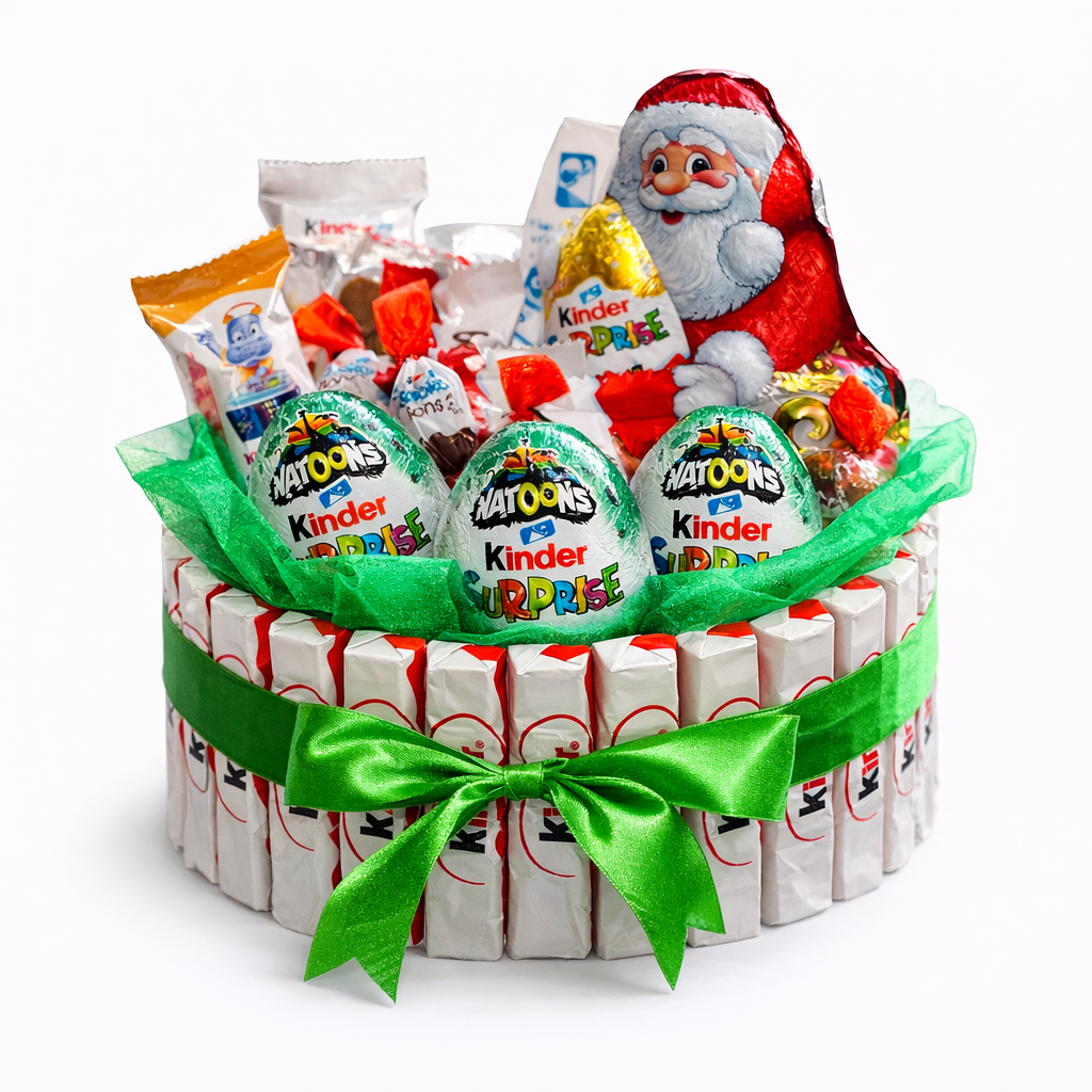 29 ks Kinder čokolád po obvode, 1x Kinder Mikuláš s vajíčkom, 3x Kinder Surprise vajíčko, 1x Kinder Bueno, 1x Kinder Country, 1x Kinder Happy Hippo, 1x Kinder cards , 1 x Kinder maxi, mix Kinder Bueno Mini a Choco Bons
