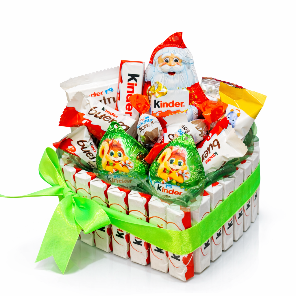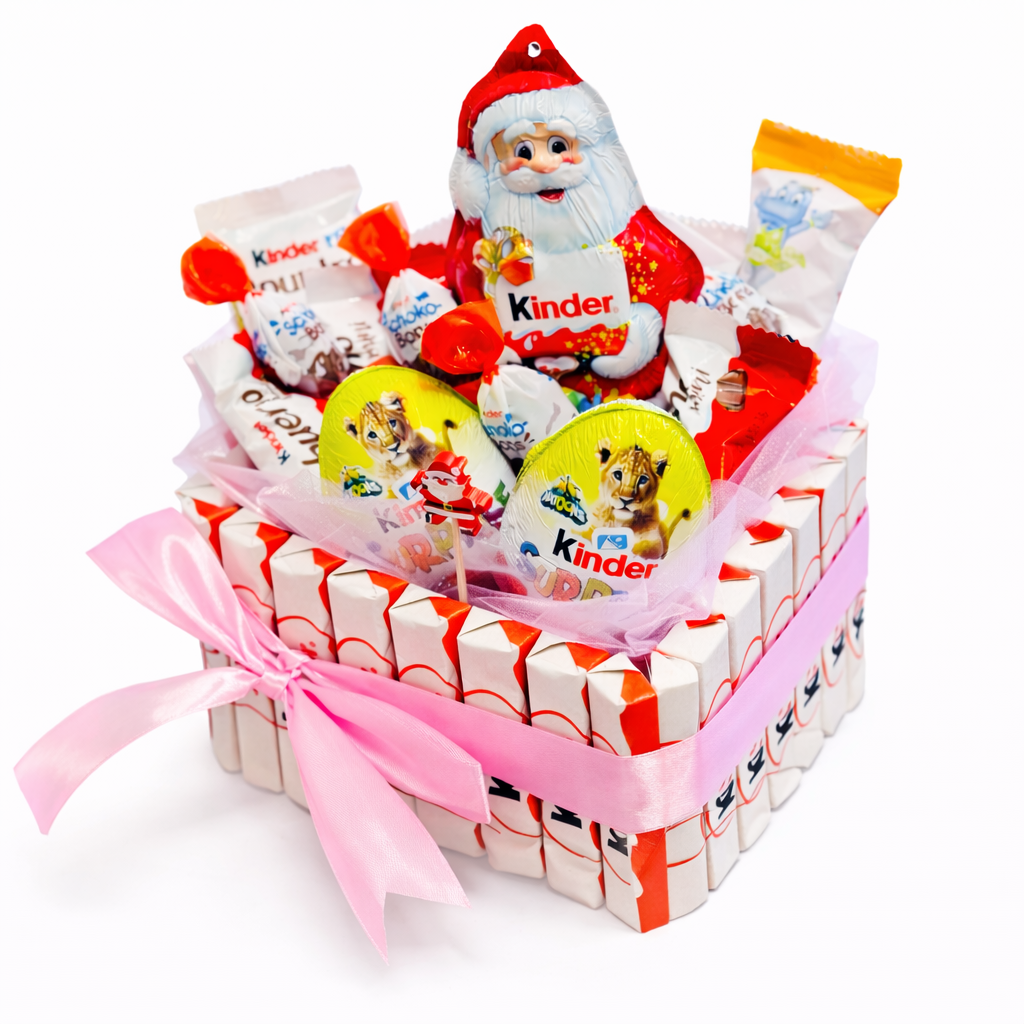 26 ks Kinder čokolád po obvode, 1x Kinder Mikuláš, 2x Kinder Surprise vajíčko, 1x Kinder Bueno, 1x Kinder Country, 1x Kinder Happy Hippo, 1x Kinder Cards, mix Kinder Bueno Mini a Choco Bons, zdobenie podľa skladových možností