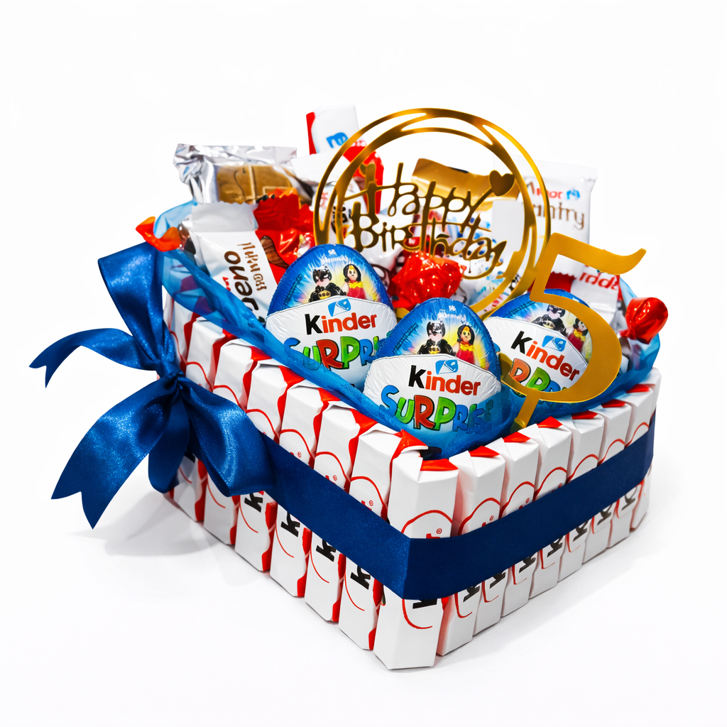29 ks Kinder čokolád po obvode, 3x Kinder Surprise vajíčko, 1x Kinder Bueno, 1x Kinder Country, 1x Kinder Cards, 1x Kinder Happy Hippo, 1x Kinder MAXI čokoláda, mix Kinder Bueno Mini a Choco Bons, zápich v zlatej farbe Happy Birthday