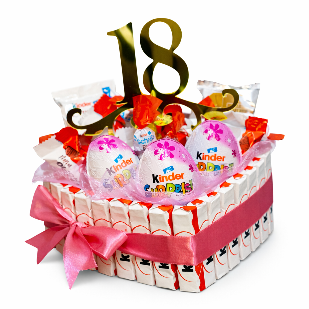 29 ks Kinder čokolád po obvode, 3x Kinder Surprise vajíčko, 1x Kinder Bueno, 1x Kinder Country, 1x Kinder Cards, 1x Kinder Happy Hippo, 1x Kinder MAXI čokoláda, mix Kinder Bueno Mini a Choco Bons, zápich s číslom 18 v zlatej farbe