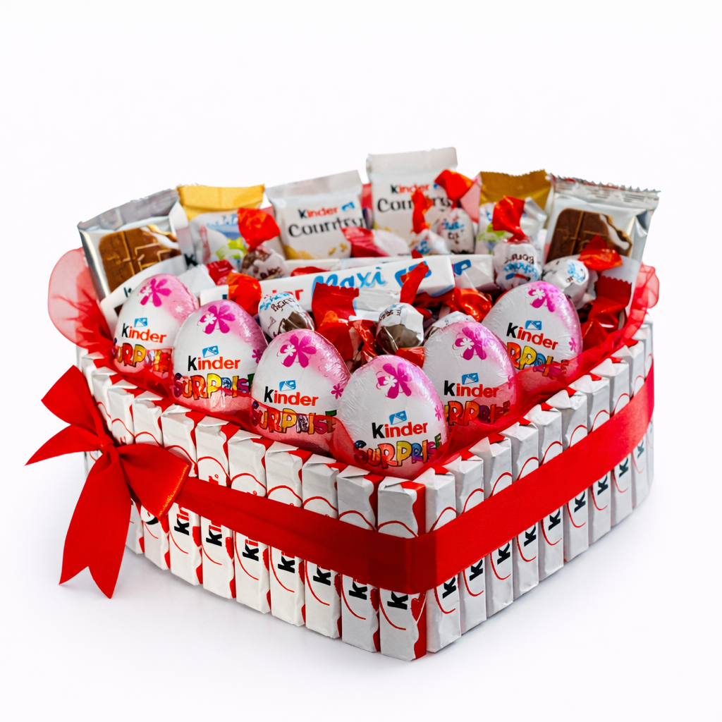 Darčekový box KINDER MIX v tvare srdca, plný všetkých dobrôt Kinder s výnimkou chladených produktov. Box sa hodí ako darček najmä k narodeninám. Veľmi častým dôvodom pre darček tohto typu je aj sviatok SV. Valentína, alebo výročie Vašej lásky.