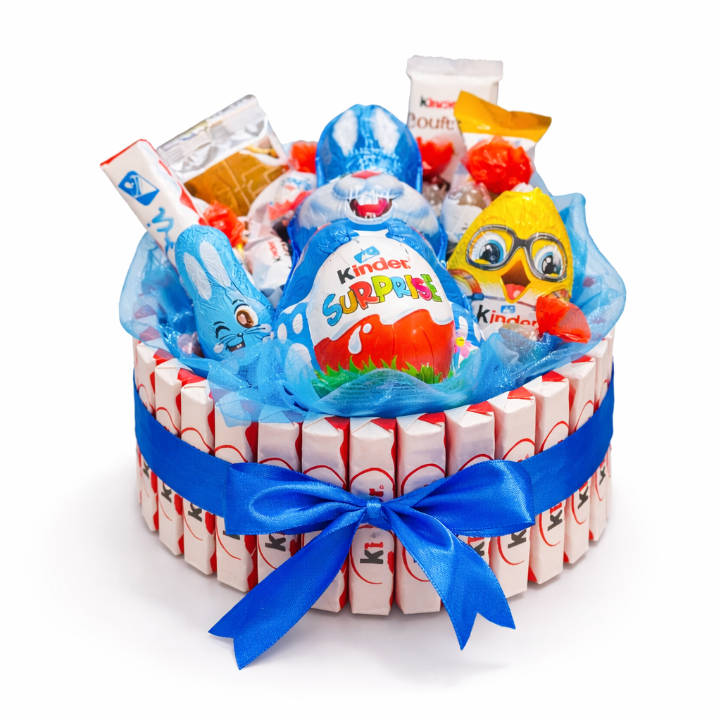 26 ks Kinder čokolád po obvode, 1x Kinder čokoládový zajac, 1 x Kinder Surprise vajíčko , 1x Kinder Maxi , 1x Kinder Cards , 1x Kinder Country, 1x Kinder Happy Hippo, zajačik, mix Kinder Bueno Mini a Choco Bons, zdobenie