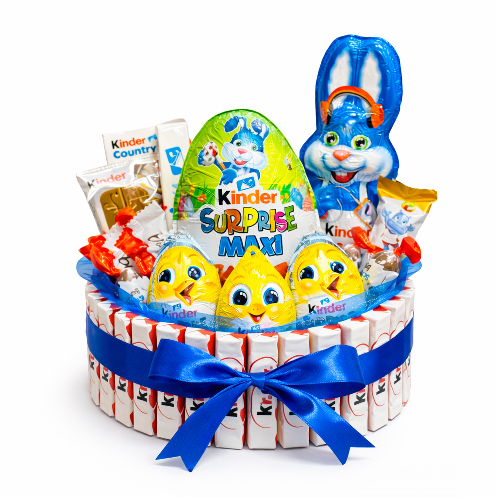 29 ks Kinder čokolád po obvode, 1x Kinder čokoládový zajac, 1x Kinder MAXI Surprise vajíčko, 3 x Kinder Surprise vajíčko , 1x Kinder Bueno , 1x Kinder Cards , 1x Kinder Country, 1x Kinder Happy Hippo, 1x Kinder Maxi čokoláda, mix Kinder Bueno Mini a Choco Bons, zdobenie