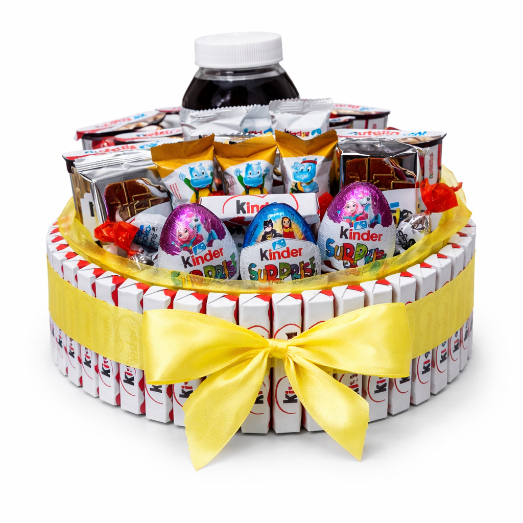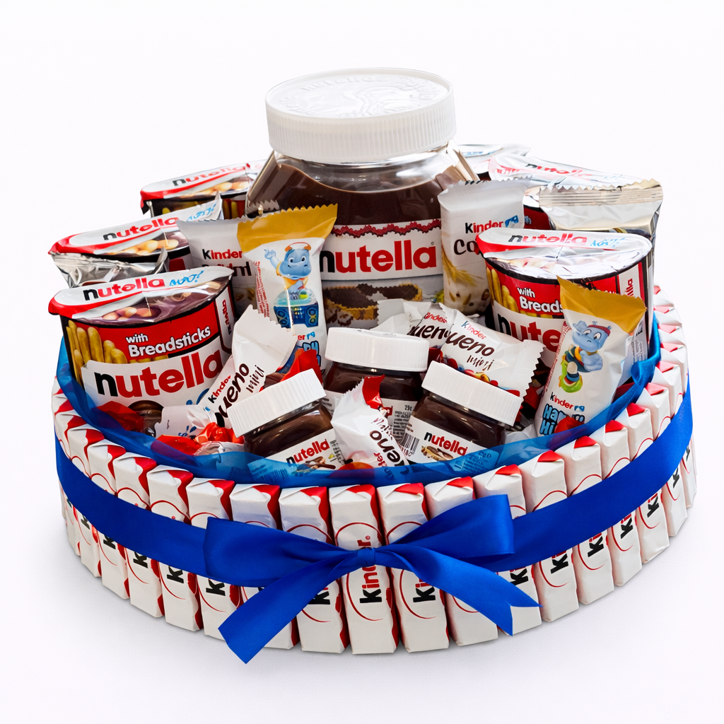 Darčekový box KINDER/ NUTELLA MIX v tvare kruh, plný všetkých dobrôt Kinder s výnimkou chladených produktov. Dominantou tohto darčekového boxu je jeho veľkosť kruh o priemere 29,5 cm, plná toho najlepšieho, čo nám trh ponúka. Hlavnými prvkami boxu okrem Kinder produktov sú výrobky z Nutelly :) Veľkosťou ide o veľký darčekový box.