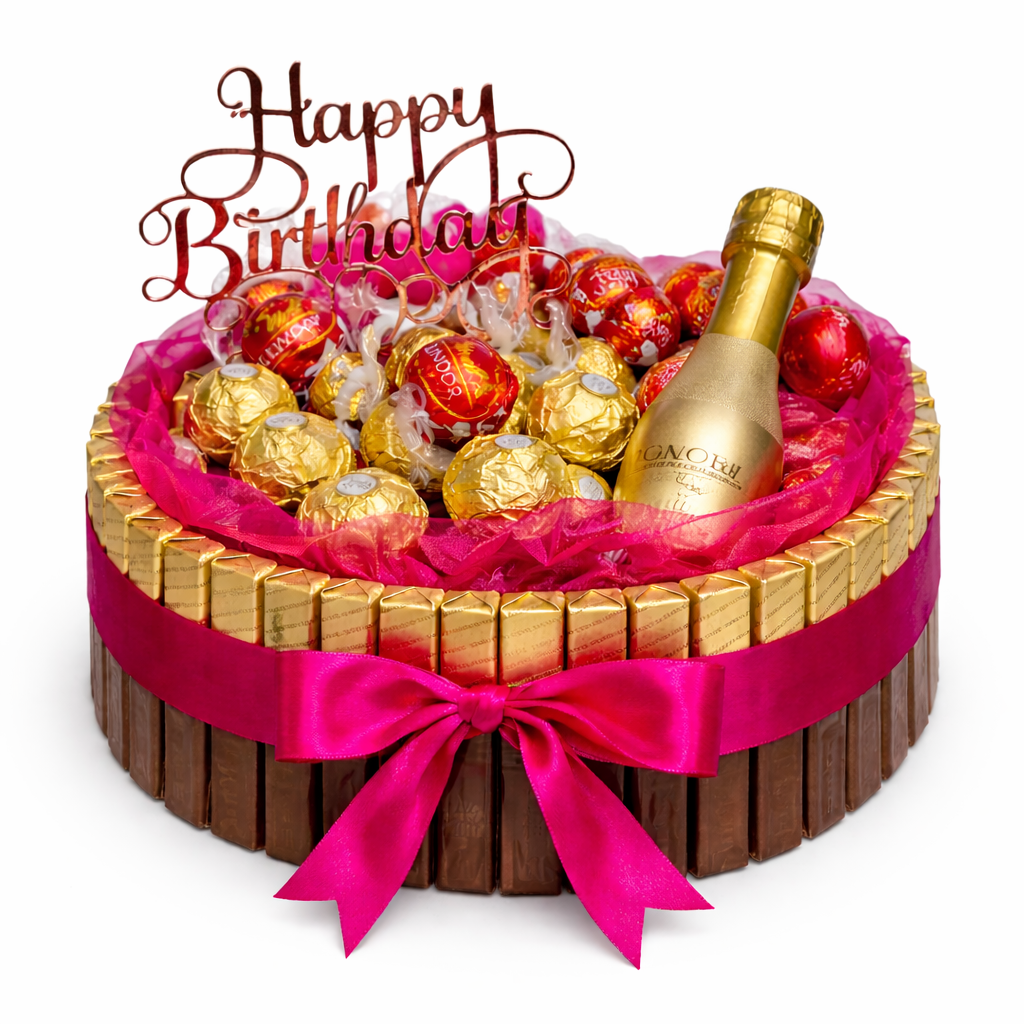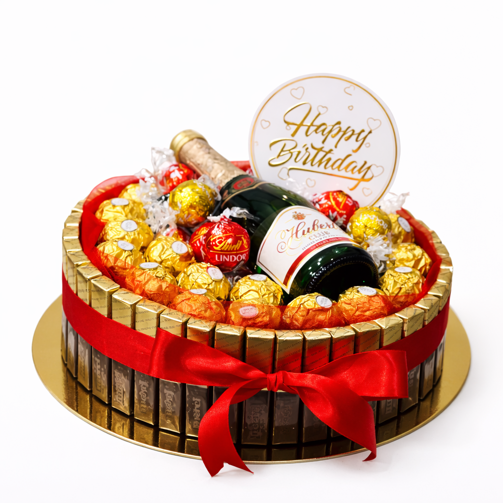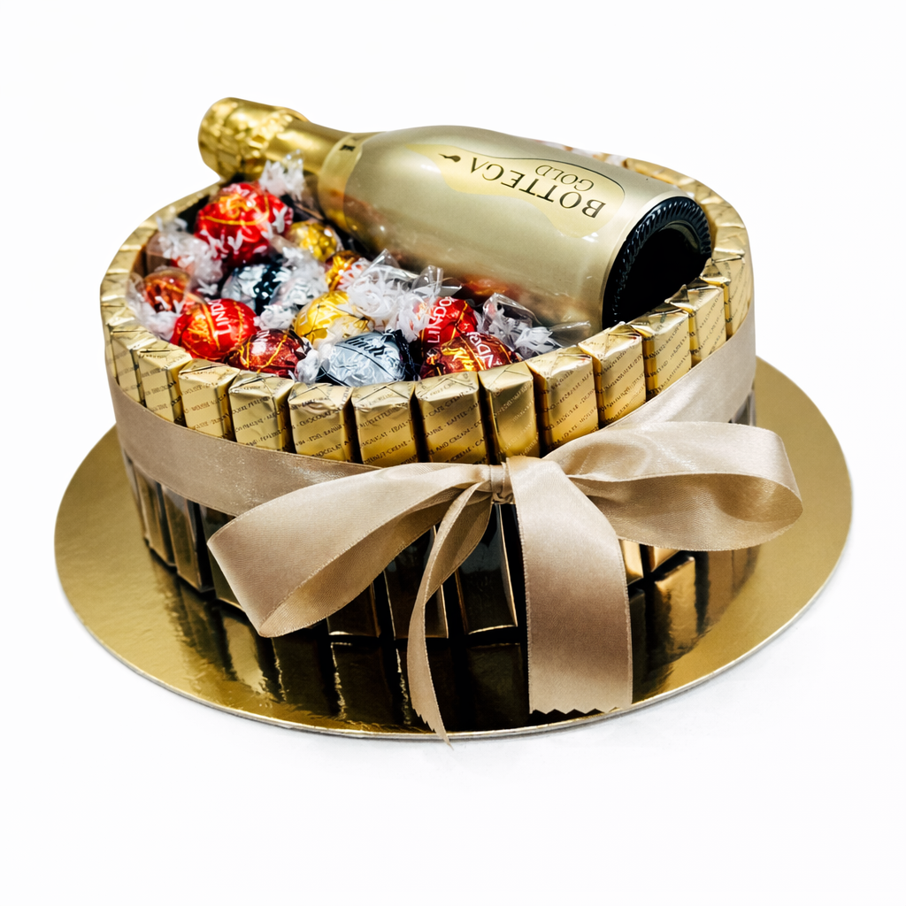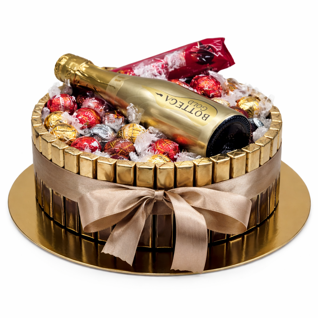 cca 28 ks Merci čokolád po obvode, pralinky Ferrero rocher 12 ks , zdobenie podľa výberu , 1x Prosecco Bottega gold/ šampanské Hubert